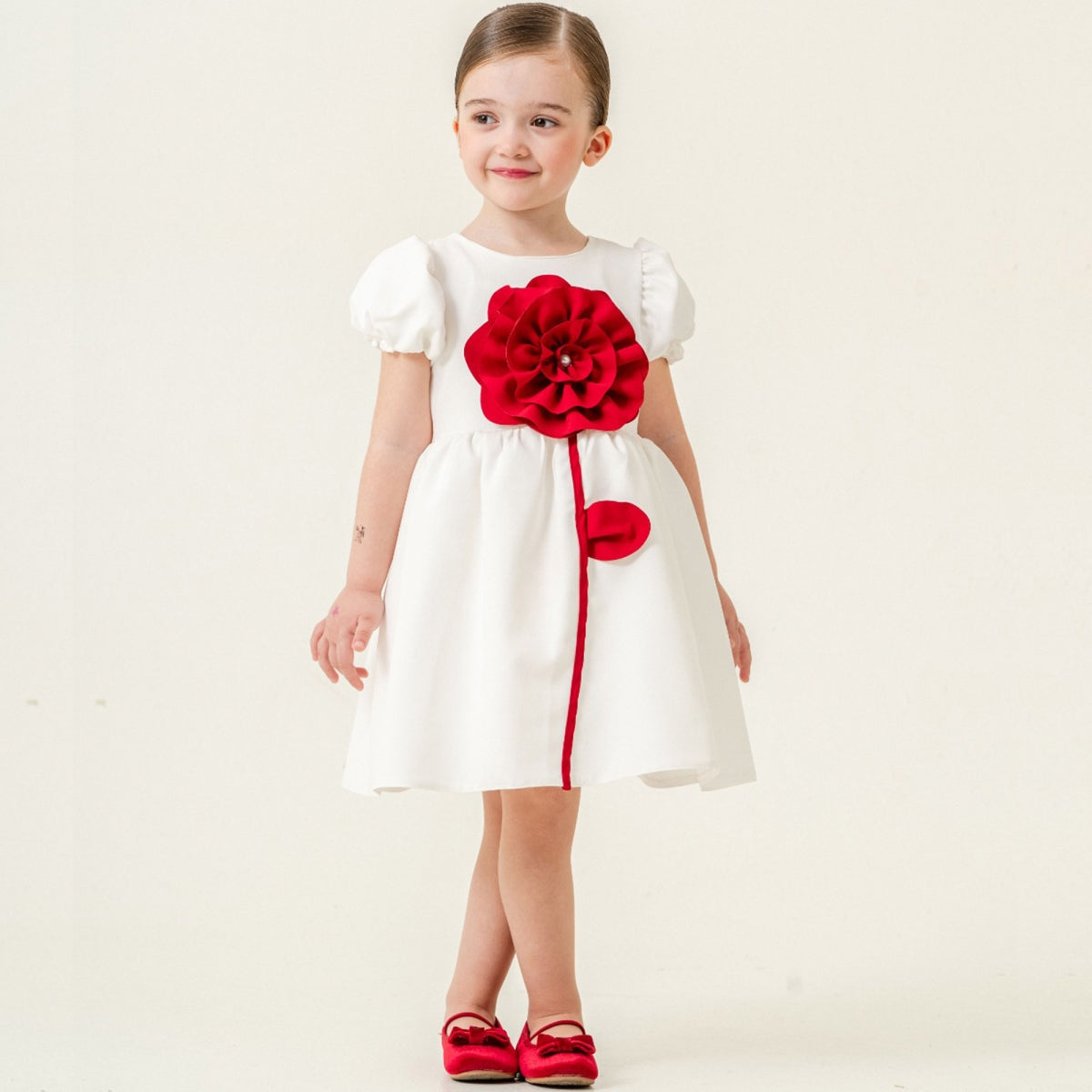 Beyaz Balon Kol Çiçekli Kız Elbisesi