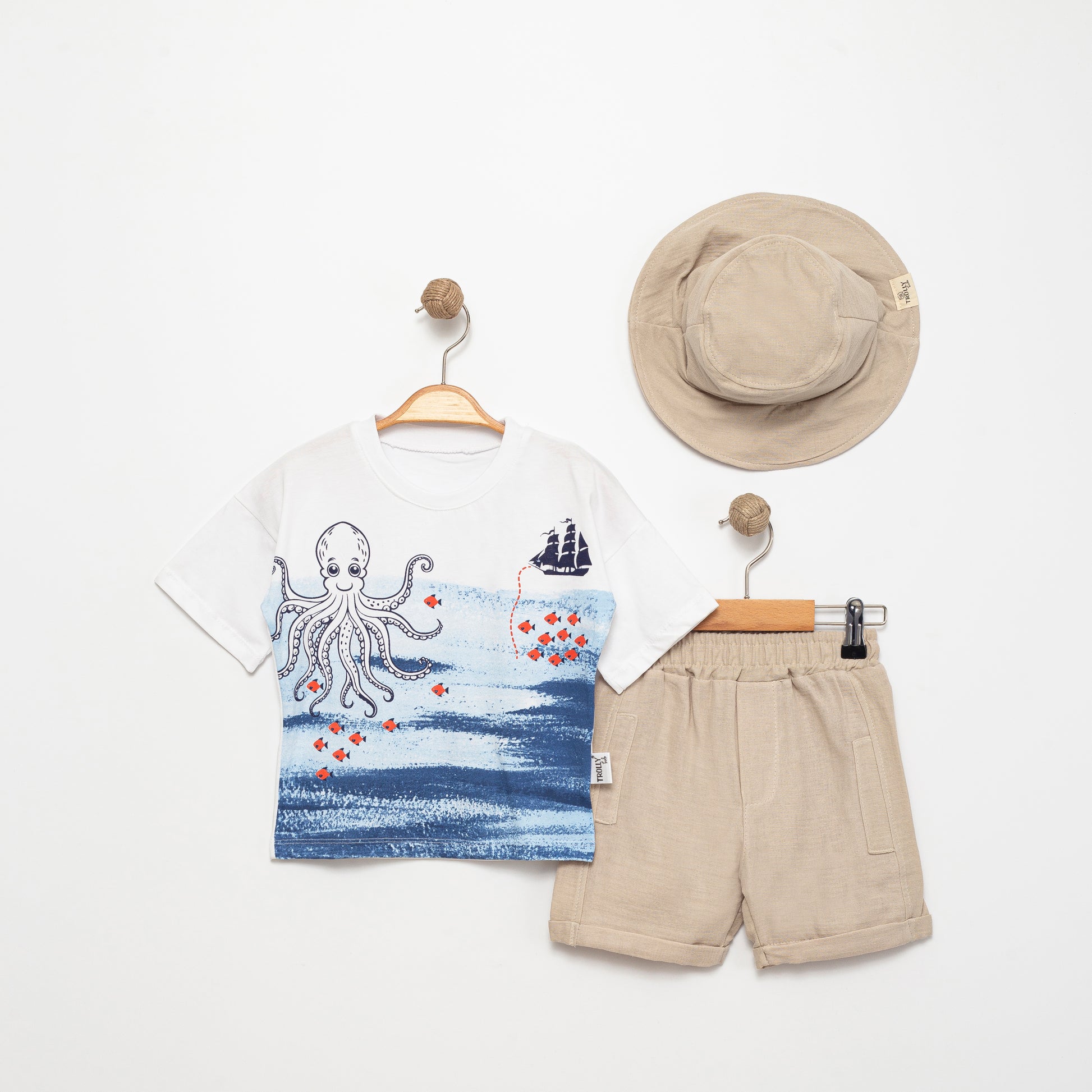 Kısa Kol ve Baskılı, Bej Erkek Çocuk 3'lü Takımı