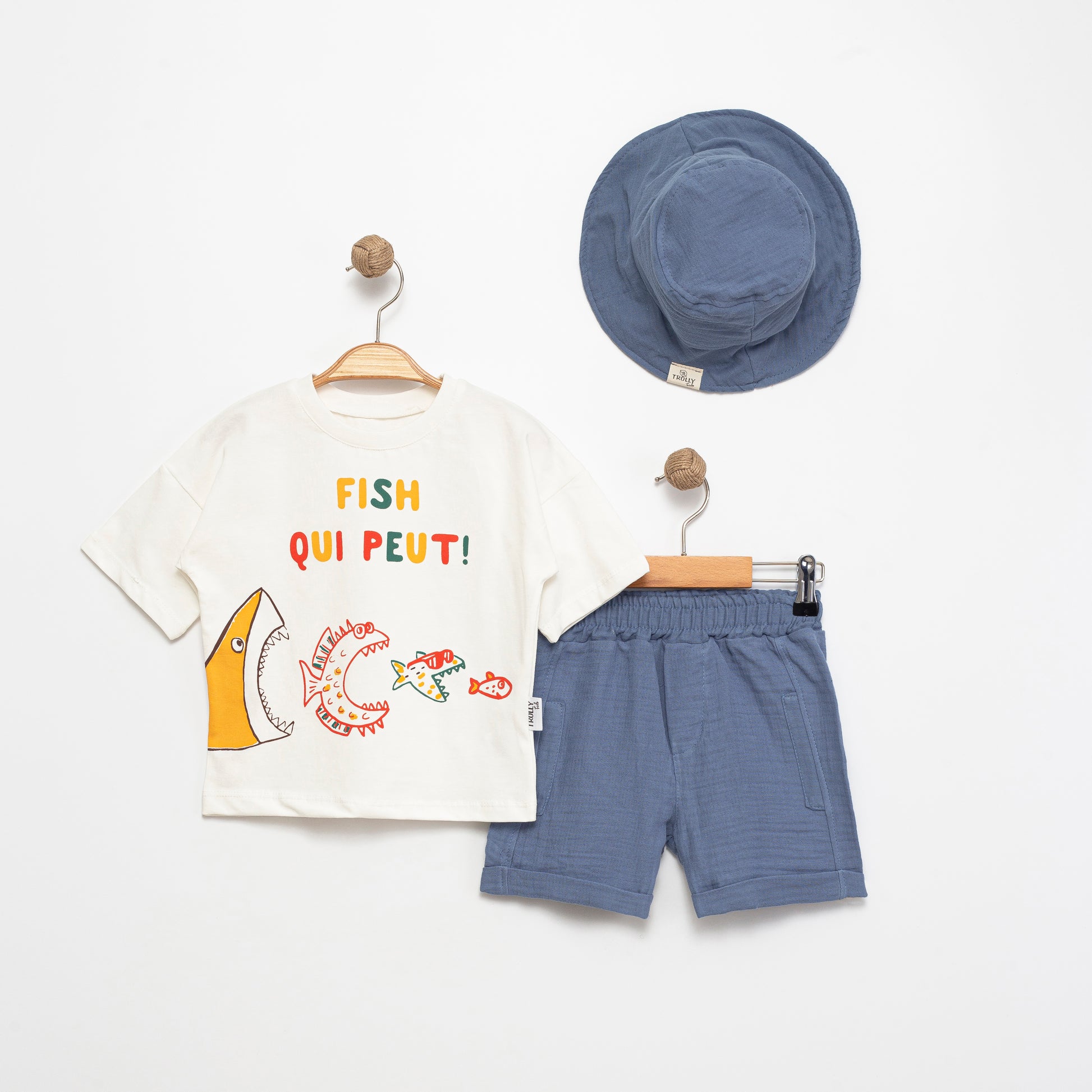 Ürünümüz 3 parça olmak üzere T-shirt, şort ve şapkadan oluşmaktadır. Şort ve şapkamız müslin kumaştan üretilmiştir.