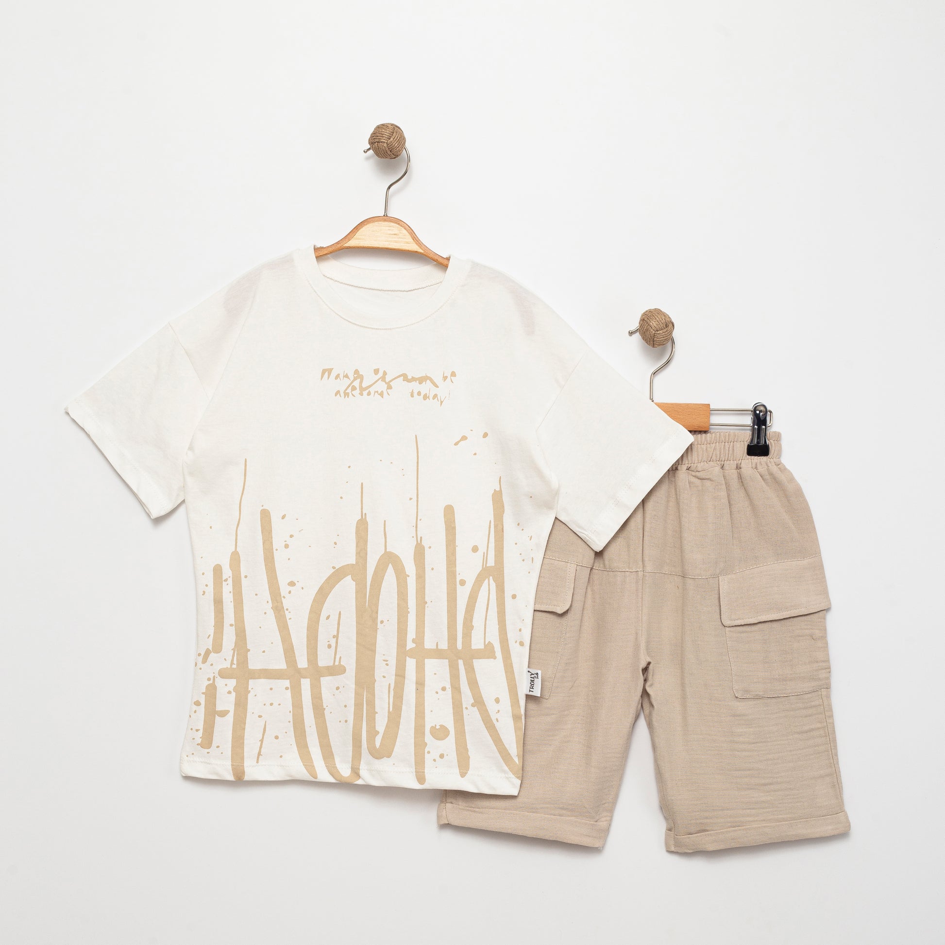 Kısa Kol ve Baskılı T-shirt, Cepli Bej Şort Erkek Çocuk 2'li takım