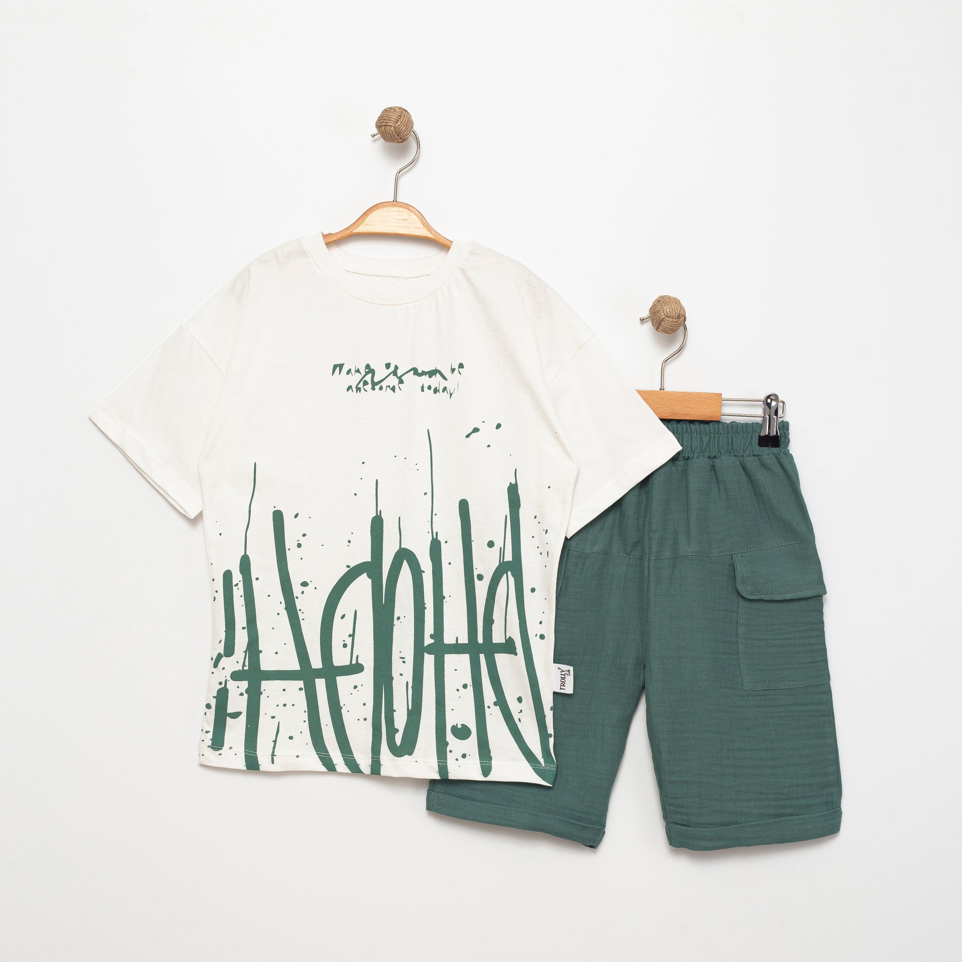 Ürünümüz 2 parça olmak üzere T-shirt, cepli şorttan oluşmaktadır. Şortumuz müslin kumaştan üretilmiştir.
