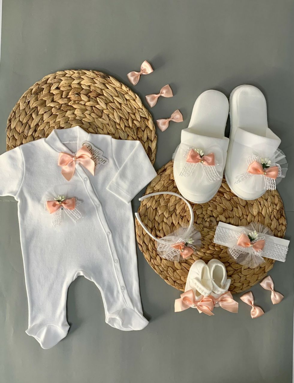 ÜRÜN İÇERİĞİ: Bebek için; Tulum, bandana ve patik. Anne için; Terlik ve taç.