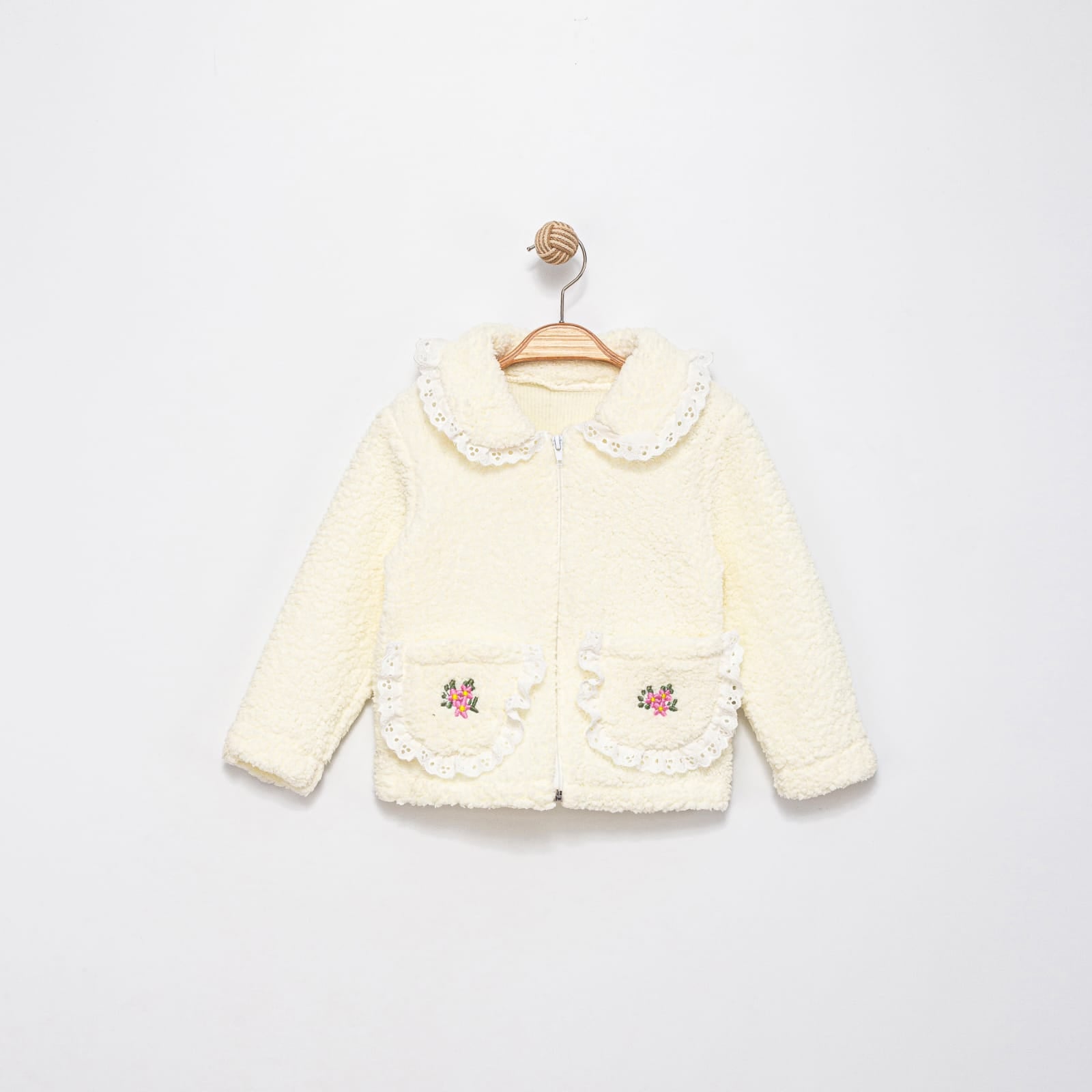 Kuzu Kumaş Dantel ve Çiçek Detaylı Çocuk Montu
